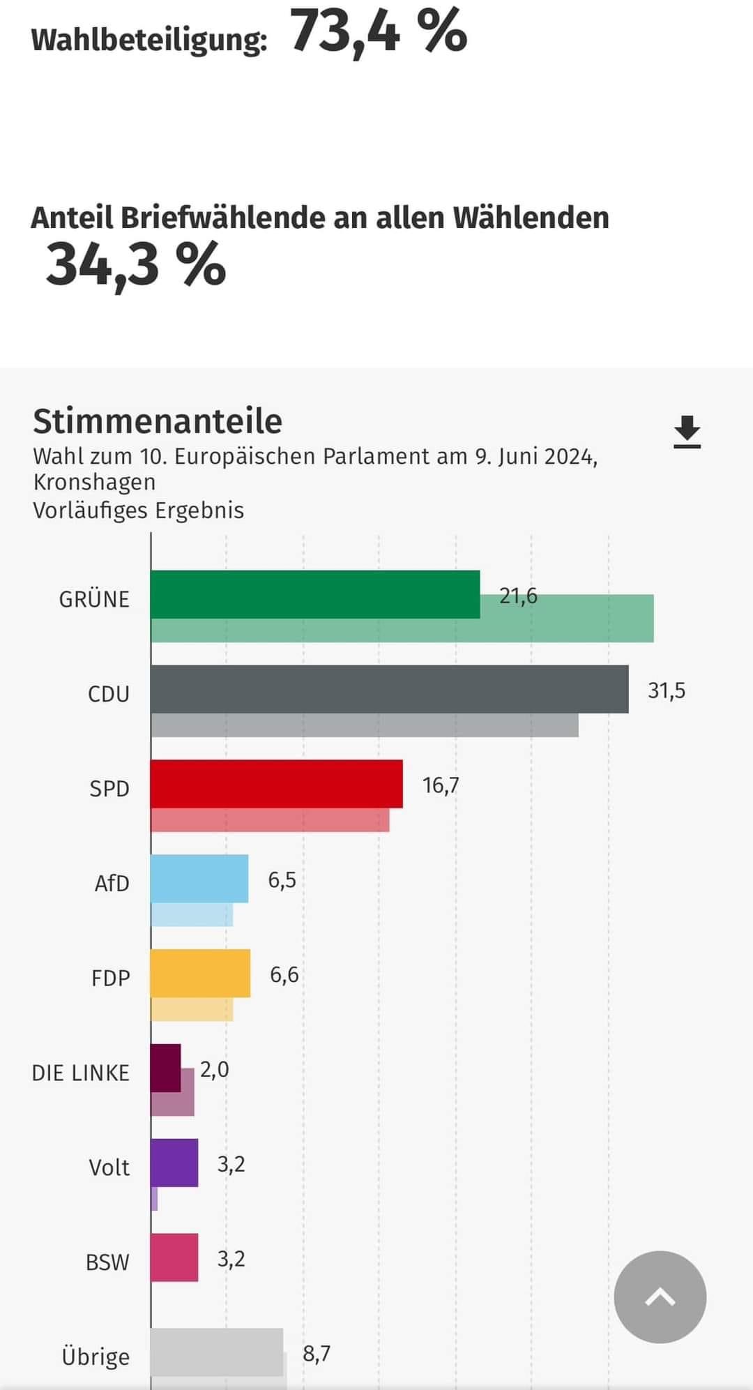 Und ganz herzlichen Dank unseren Wählerinnen und Wählern bei der Europawahl, die die CDU auch hier bei uns in Kronshagen mit 31,5% mit Abstand wieder auf Platz 1 gewählt haben. Wir freuen uns über das Vertrauen und über die herausragend hohe Wahlbeteilung von 73,4%