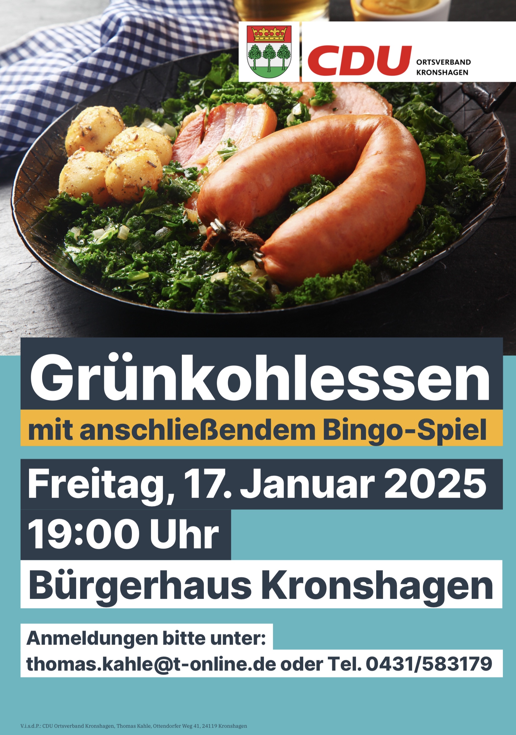 Der CDU-Ortsverband Kronshagen lädt für Freitag, den 17. Januar 2025 ab 19:00 Uhr wieder herzlich ein zu seinem inzwischen schon traditionellen Neujahrs-Grünkohlessen ins Bürgerhaus Kronshagen. Nach dem Essen führen wir wieder unser beliebtes Bingospielen durch, bei dem es in mehreren Spielrunden schöne Preise zu gewinnen gibt.