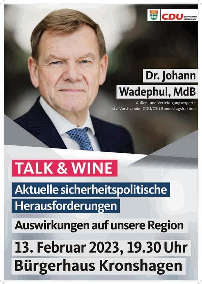 Das war wieder eine sehr informative und gut besuchte Veranstaltung aus unserer Reihe "Talk & Wine", diesmal mit dem stellvertretenden Vorsitzenden der CDU/CSU-Bundestagsfraktion Dr. Johann Wadephul zum Thema "Sicherheitspolitische Herausforderungen - Auswirkungen auf unsere Region". Vielen Dank auch unserem Vorstandsmitglied Dr. Viveka Thun-Blasche für die Moderation!
