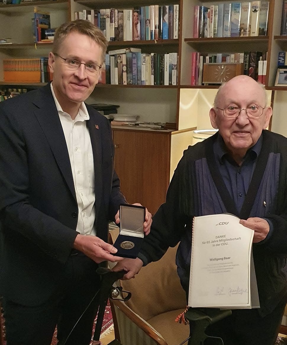 Aus diesem Grunde besuchten ihn der Kronshagener CDU-Ortsvorsitzende Thomas Kahle und die Mitgliederbeauftragte Regina Raubusch am späten Freitag Nachmittag in seinem Haus und überreichten ihm einen grossen Blumenstrauß und ein Weinpräsent. Als besondere Überraschung hatten die beiden den CDU-Landesvorsitzenden und Schleswig-Holsteinischen Ministerpräsidenten Daniel Günther mitgebracht, der es sich trotz seines vollen Terminkalenders nicht hat nehmen lassen, einem so langjährigen Mitglied persönlich zu gratulieren, ihm für seine Treue zu danken und ihm eine Ehrenmedaille der CDU Deutschlands zu überreichen und eine Ehrenurkunde, persönlich unterschrieben von unserem CDU-Bundesvorsitzenden Friedrich Merz, ihm selbst als CDU- Landesvorsitzenden und unserem Rendsburg-Eckernförder CDU-Kreisvorsitzenden Dr. Johann Wadephul, MdB.