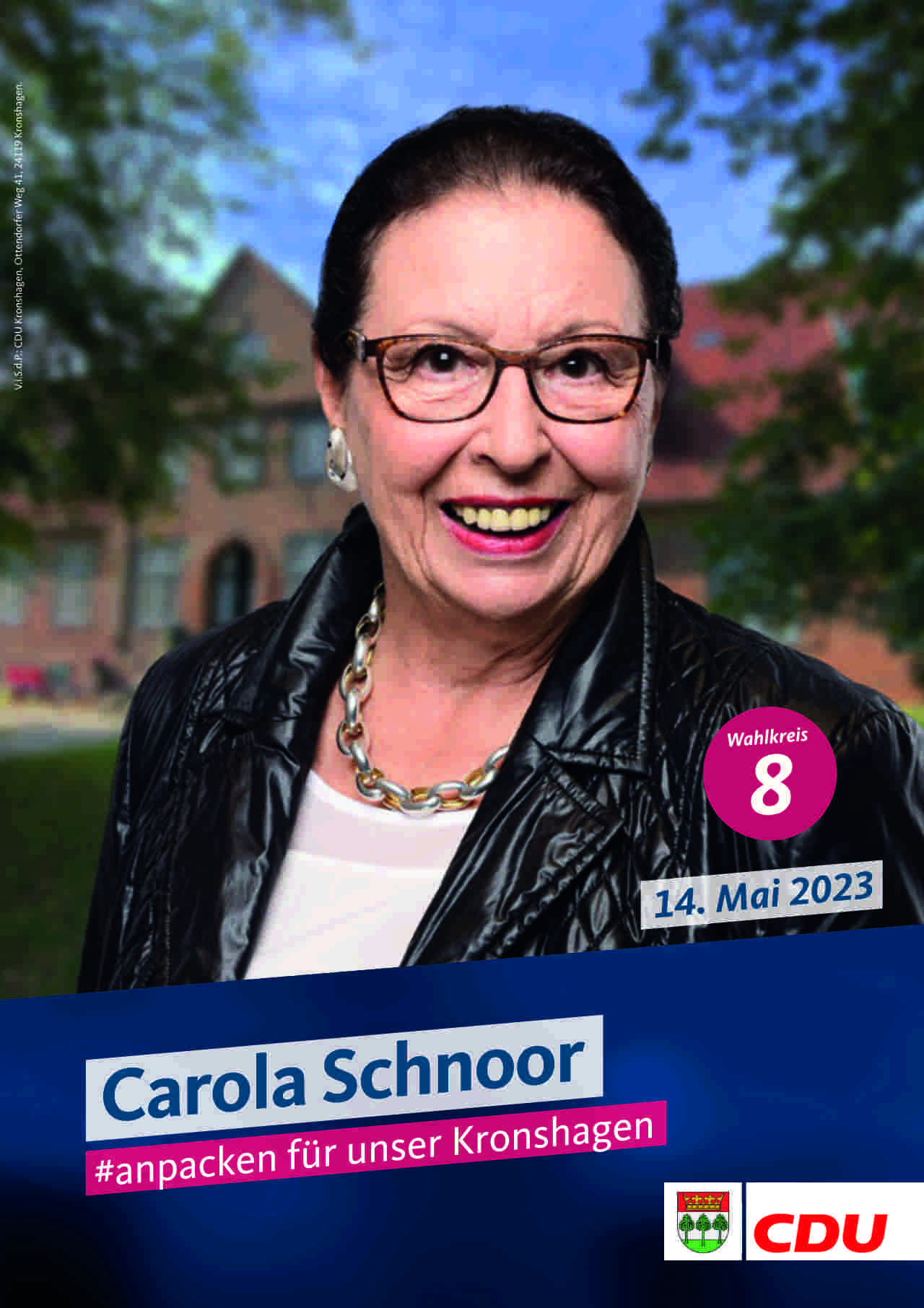 Am 14. Mai entscheiden Sie wieder über die zukünftige Zusammensetzung Ihrer Kronshagener Gemeindevertretung, der ich seit dem Jahre 2003 angehöre. Mein Name ist Carola Schnoor. Ich bin verwitwet, habe 4 inzwischen erwachsene Kinder, die alle in Kronshagen aufgewachsen sind und unsere Kronshagener Kitas, Schulen und den Sportverein besucht haben.