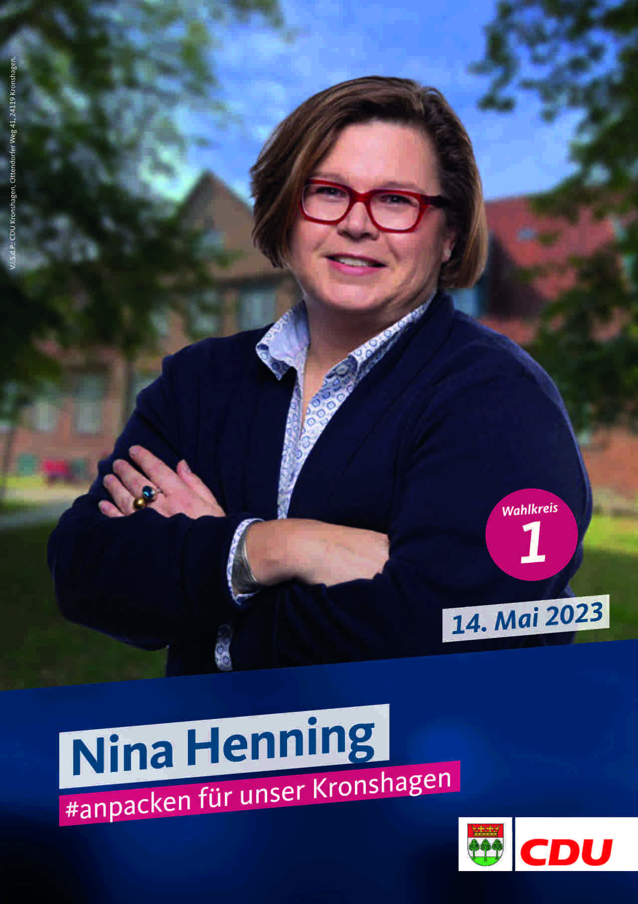 Ich heiße Nina Henning, bin 45 Jahre alt und in Kiel geboren. Nach den Auslandsstationen Türkei, Indien und Argentinien habe ich 2007 meine Heimat in unserer Gemeinde Kronshagen gefunden. Seit 2005 arbeite ich als Lehrerin am Berufsbildungszentrum Plön. In meiner Freizeit spiele ich Volleyball und im Sommer Beachvolleyball auf unserem gemeindeeigenen Platz an den Sportstätten am Suchsdorfer Weg. Gerne gehe ich in Theateraufführungen und in Konzerte des Landestheaters.