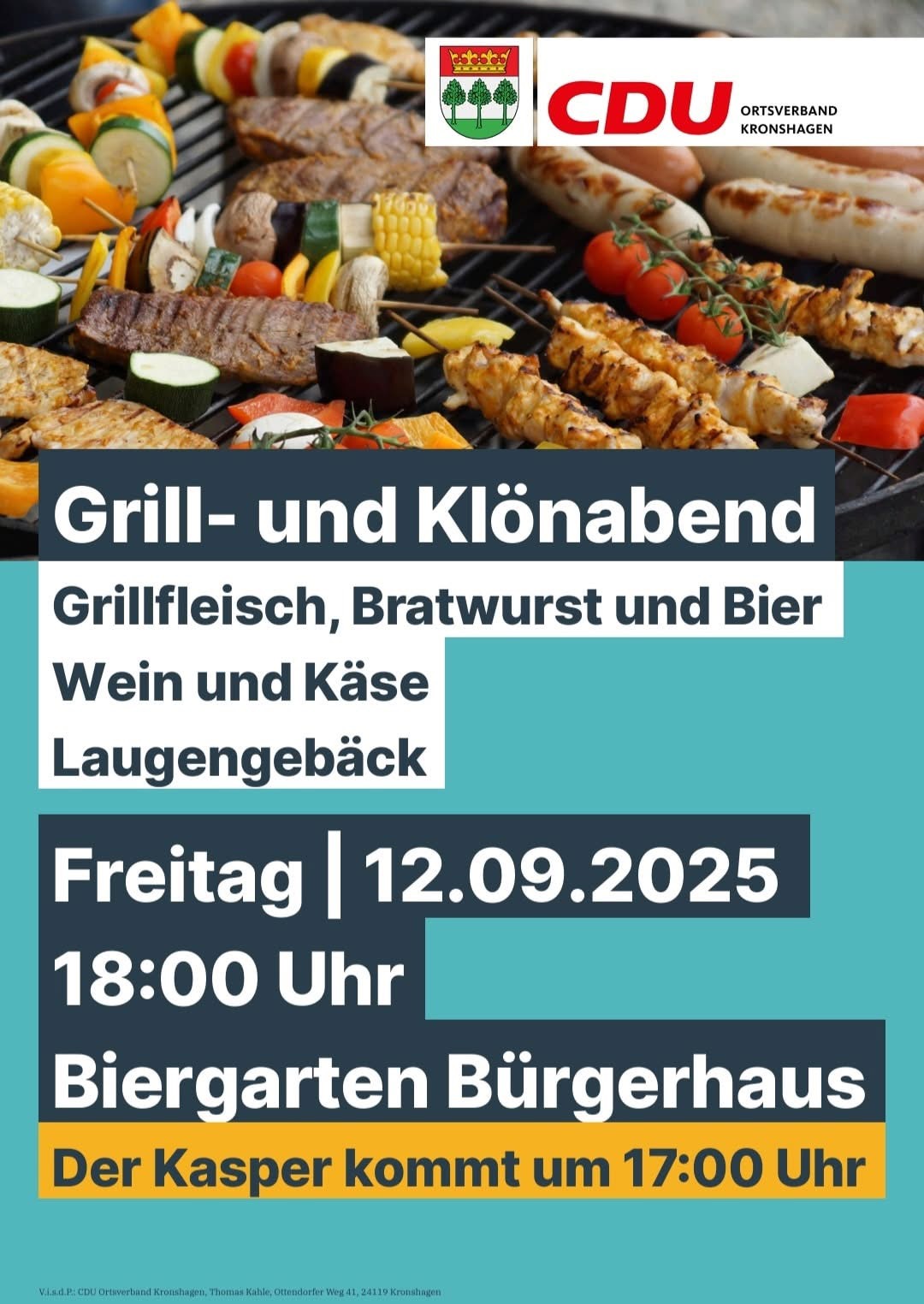 Die CDU Kronshagen zusammen mit dem Kieler CDU-Ortsverband Mitte, die JU Kronshagen, die SeniorenUnion Kronshagen und die FrauenUnion Kronshagen laden wieder herzlich ein zu ihrem jährlichen Grill- und Klönabend nach den Sommerferien im Biergarten des Bürgerhauses Kronshagen.