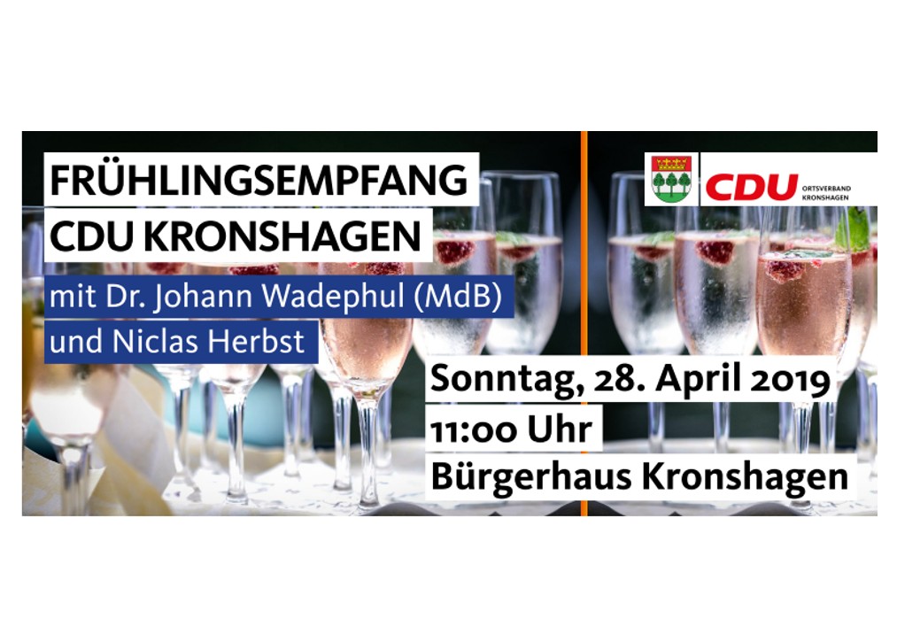 Der CDU-Ortsverband Kronshagen lädt Sie herzlich zu seinem Frühlingsempfang 2019 ein ins Bürgerhaus Kronshagen. Als besondere Gäste erwarten wir unseren CDU-Kreisvorsitzenden und Bundestagsabgeordneten Dr. Johann-David Wadephul sowie den Spitzenkandidaten der CDU Schleswig-Holstein zur Europawahl am 26. Mai 2019, Niclas Herbst. Für Kinderbetreuung ist gesorgt, für Ihr leibliches Wohl ebenso.