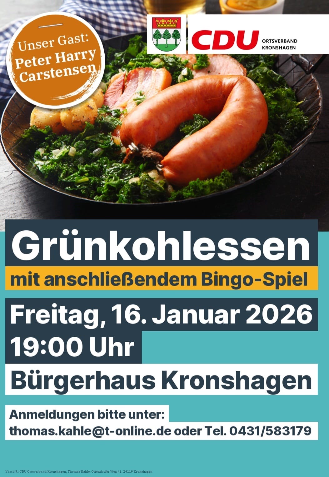 Der CDU-Ortsverband Kronshagen lädt für Freitag, den 16. Januar 2026 ab 19:00 Uhr wieder herzlich ein zu seinem inzwischen schon traditionellen Neujahrs-Grünkohlessen ins Bürgerhaus Kronshagen. Wir freuen uns sehr, als besonderen Gast unseren früheren Ministerpräsidenten und CDU-Landesvorsitzenden Peter Harry Carstensen begrüßen zu können.