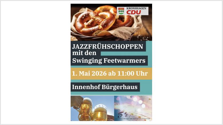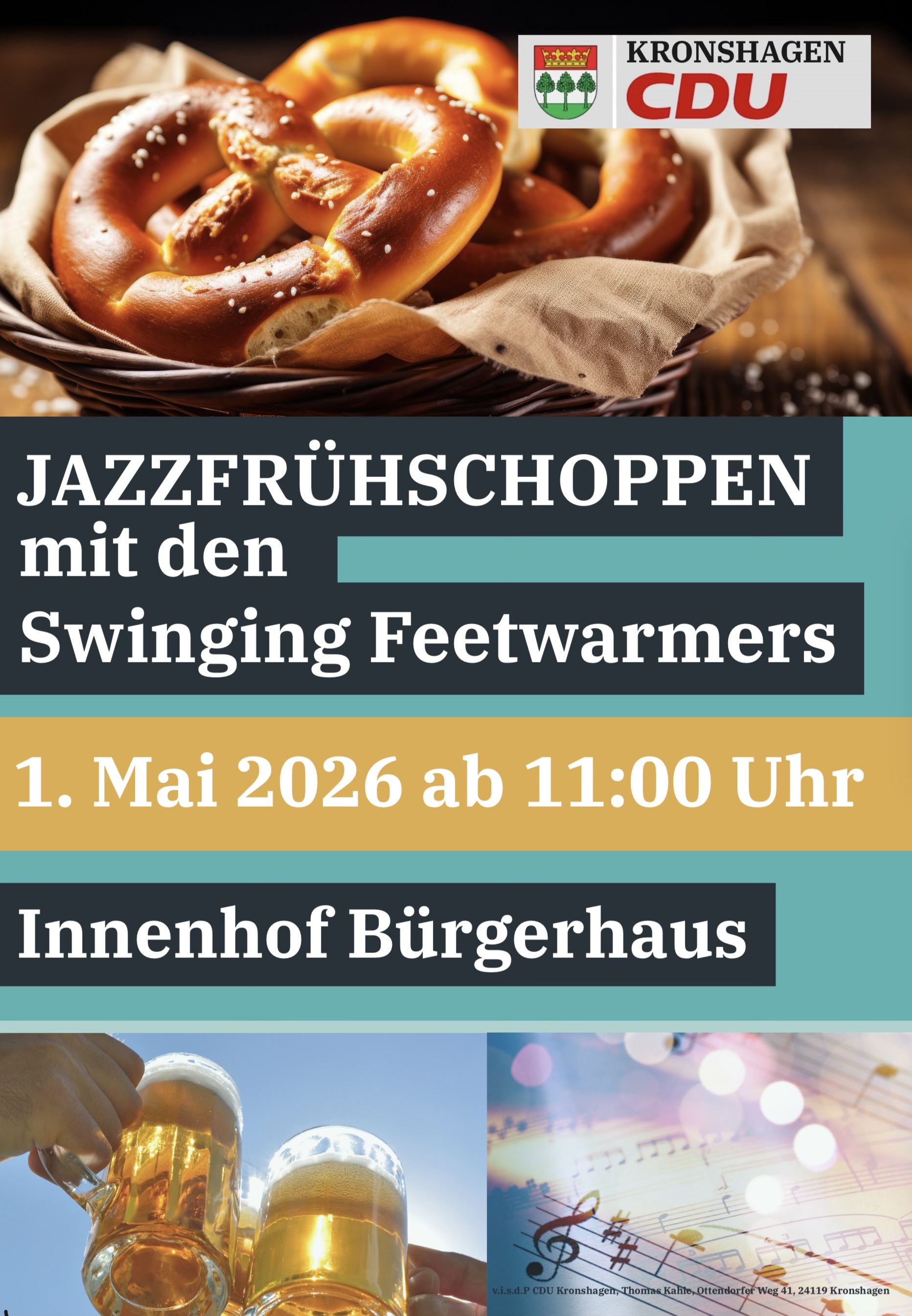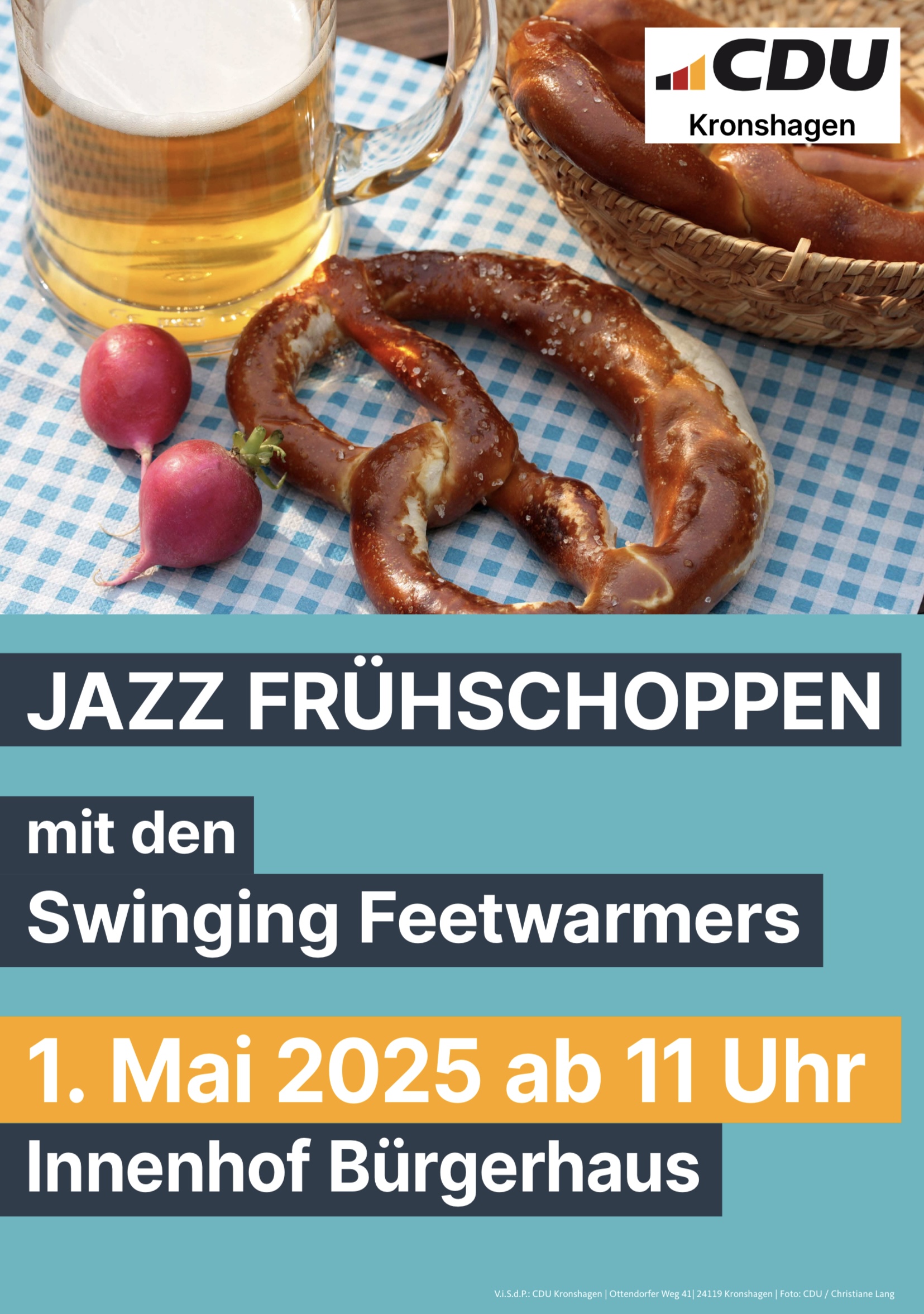 Die CDU Kronshagen lädt wieder herzlich ein zum Jazzfrühschoppen mit den Swinging Feetwarmers am 1. Mai ab 11:00 Uhr in den Biergarten am Bürgerhaus Kronshagen. Der Eintritt ist frei. Es gibt Bier vom Fass und natürlich Maibock, Wein, Mineralwasser und Softdrinks, Käsespiesse, Laugenstangen und Bratwurst vom Grill.