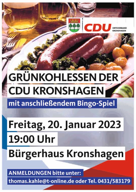 Der CDU-Ortsverband Kronshagen lädt für Freitag, den 20. Januar 2023 ab 19:00 Uhr wieder herzlich ein zu seinem inzwischen schon traditionellen Neujahrs-Grünkohlessen ins Bürgerhaus Kronshagen. Nach dem Essen führen wir wieder unser beliebtes Bingospielen durch, bei dem es in mehreren Spielrunden schöne Preise zu gewinnen gibt.