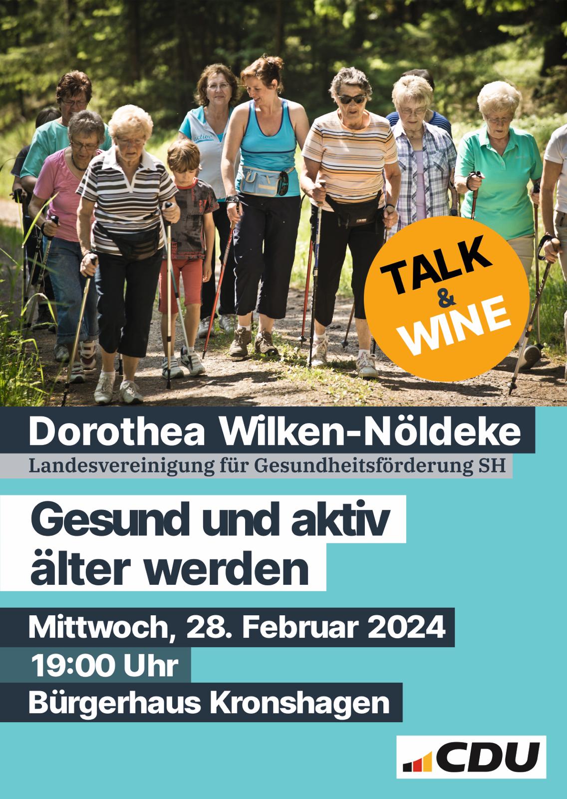 Wir laden ein zur nächsten Informations und Diskussionsveranstaltung aus unserer Reihe "Talk & Wine". Diesmal begrüßen wir Frau Dorothea Wilken-Nöldeke von der Landesvereinigung für Gesundheitsförderung Schleswig-Holstein, die zum Thema "Gesund und aktiv älter werden" referiert. Moderiert wird die Veranstaltung von Dr. Viveka Thun-Blasche.