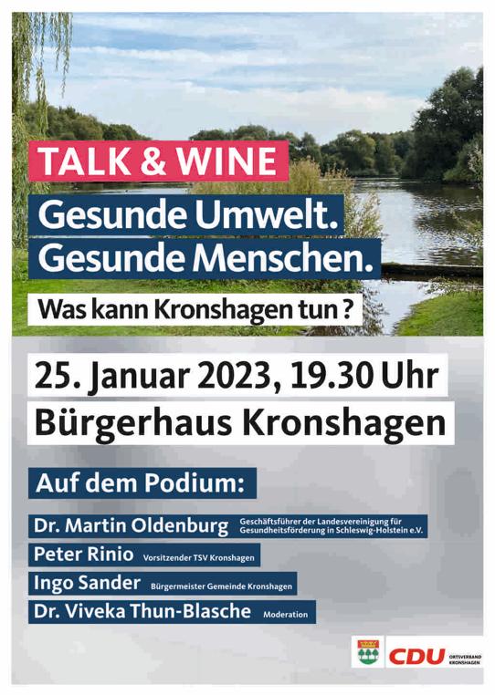 Der CDU-Ortsverband Kronshagen lädt herzlich ein zu seiner Veranstaltung "Talk & Wine: Gesunde Umwelt. Gesunde Menschen. Was kann Kronshagen tun?".
