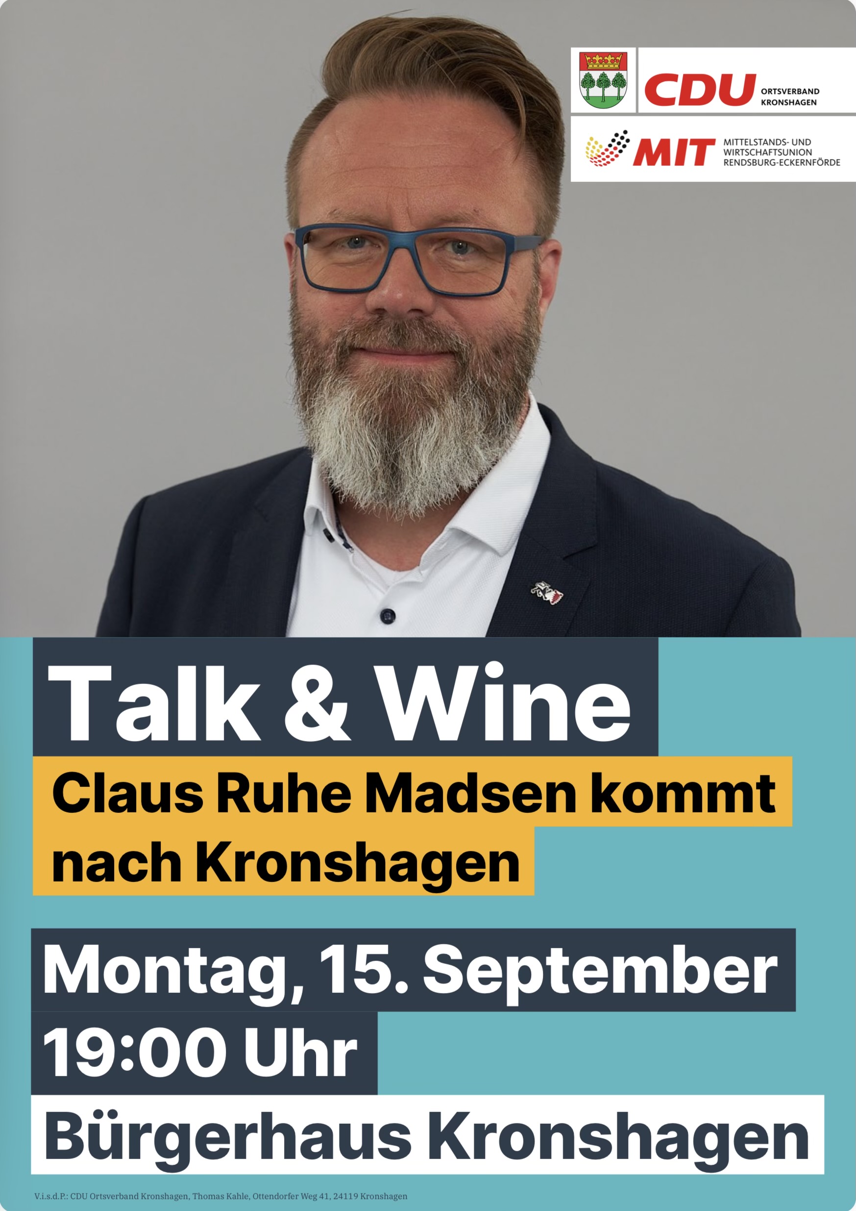Die CDU Kronshagen und die MIT Rendsburg-Eckernförde laden herzlich ein ins Bürgerhaus Kronshagen am Montag, den 15. September 2025 um 19:00 Uhr zur nächsten Veranstaltung "Talk & Wine" mit Claus Ruhe Madsen, unserem Minister für Wirtschaft, Verkehr, Arbeit, Technologie und Tourismus in der Schleswig-Holsteinischen Landesregierung.